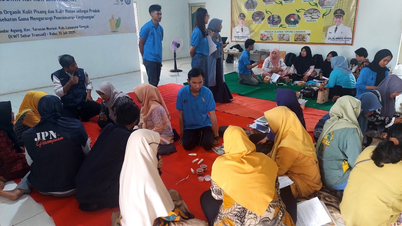 “Tujuan kegiatan ini agar dapat meningkatkan kreativitas dan potensi pengolahan limbah serta meningkatkan nilai tambah produk dan menanamkan jiwa kewirausahaan kepada para kelompok Wanita Tani (KWT) desa tersebut.