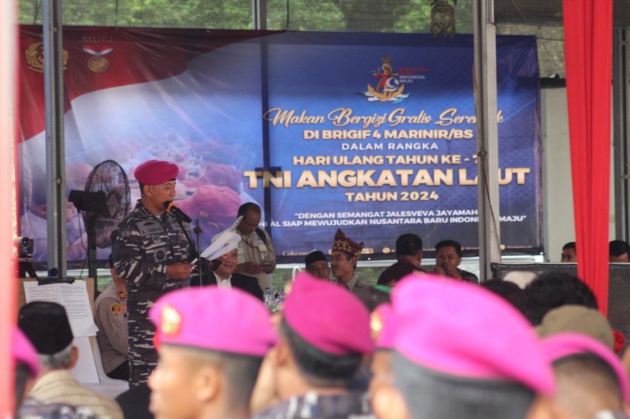 Komandan Brigif 4 Mar/BS, Kolonel Marinir Supriadi Tarigan S.IP., .M.M., dalam sambutannya menyampaikan bahwa kegiatan ini merupakan wujud nyata dari kepedulian Brigif 4 Mar/BS terhadap kesejahteraan dan kesehatan masyarakat. “Kami berharap, kegiatan ini tidak hanya membantu dari sisi kebutuhan pangan, tetapi juga mempererat hubungan antara TNI AL khususnya Brigif 4 Mar/BS dengan masyarakat,“ ujarnya.