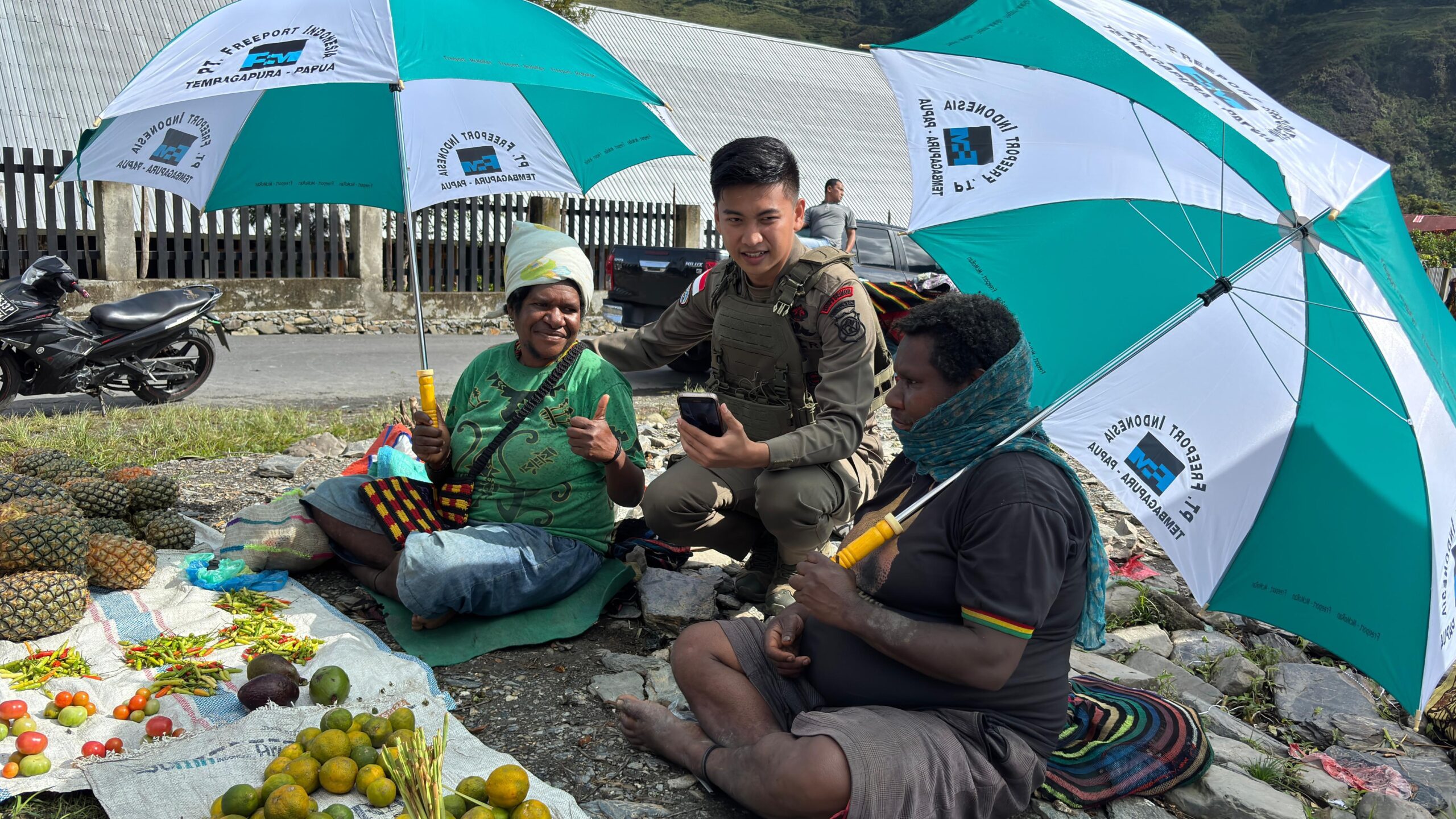 Personel Satbrimob Polda Papua, Bripda Rafly, yang tergabung dalam Operasi Damai Cartenz-2025 penugasan Puncak Jaya, turun langsung membagikan payung kepada para pedagang. Salah satu penerima bantuan tersebut adalah Lentera Wenda, seorang mama Papua yang sehari-hari berjualan di pasar.