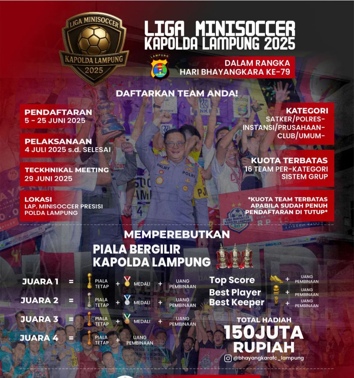 Lampung ——Newsanalis.Com – Kepolisian Daerah Lampung akan segera menggelar turnamen Minisoccer Kapolda Cup 2025 yang dijadwalkan dibuka pada 4 Juli 2025 di Lapangan Presisi Polda Lampung.