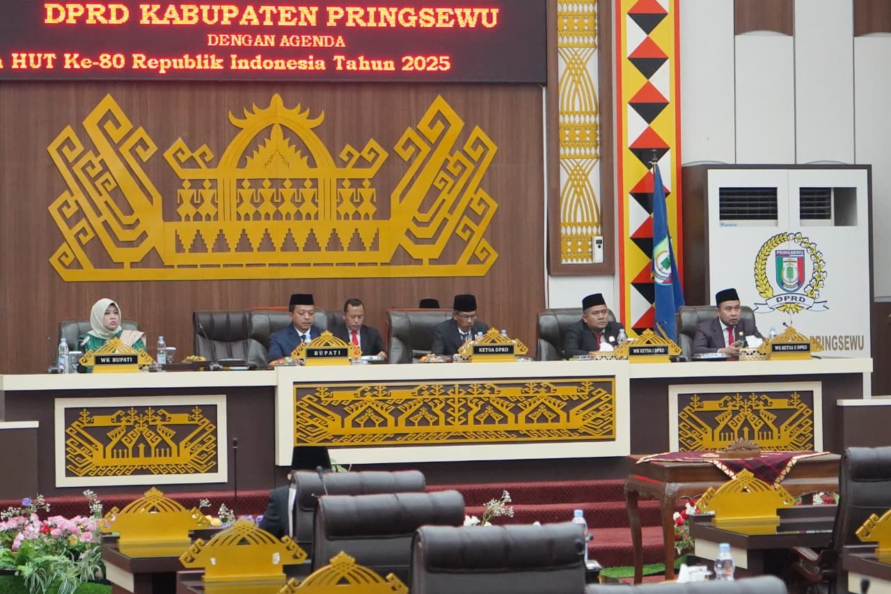 PRINGSEWU |Newsanalis.com- Rapat paripurna istimewa mendengarkan pidato kenegaraan Presiden RI dalam rangka HUT ke-80 proklamasi kemerdekaan Indonesia pada sidang tahunan MPR serta sidang bersama DPR dan DPD RI digelar di gedung DPRD Pringsewu, Jumat (15/08/2025).