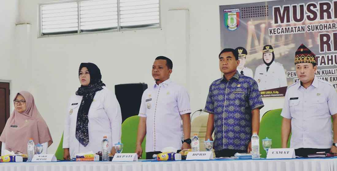 SUKOHARJO | Newsanalis.com- Bupati Pringsewu Riyanto Pamungkas dan Wakil Bupati Pringsewu Umi Laila menghadiri Musyawarah Rencana Pembangunan (Musrenbang) Kecamatan Sukoharjo dalam rangka penyusunan Rencana Kerja Pemerintah Daerah (RKPD) Kabupaten Pringsewu Tahun 2027. Kegiatan ini dihadiri jajaran pemerintah daerah, kecamatan dan pekon, uspika serta anggota DPRD daerah pemilihan setempat.