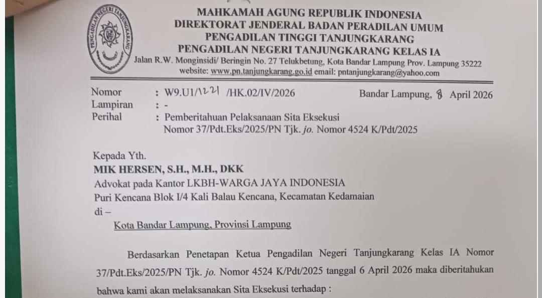 “Iya, benar. Kami selaku kuasa hukum Nuryadin telah menerima surat pemberitahuan pelaksanaan sita eksekusi atas penetapan Ketua PN Tanjung Karang Nomor 37/Pdt.Eks/2025/PN.Tjk juncto Nomor 4524 K/Pdt/2025,” ujar Mik Hersen, Selasa (14/4/2026).